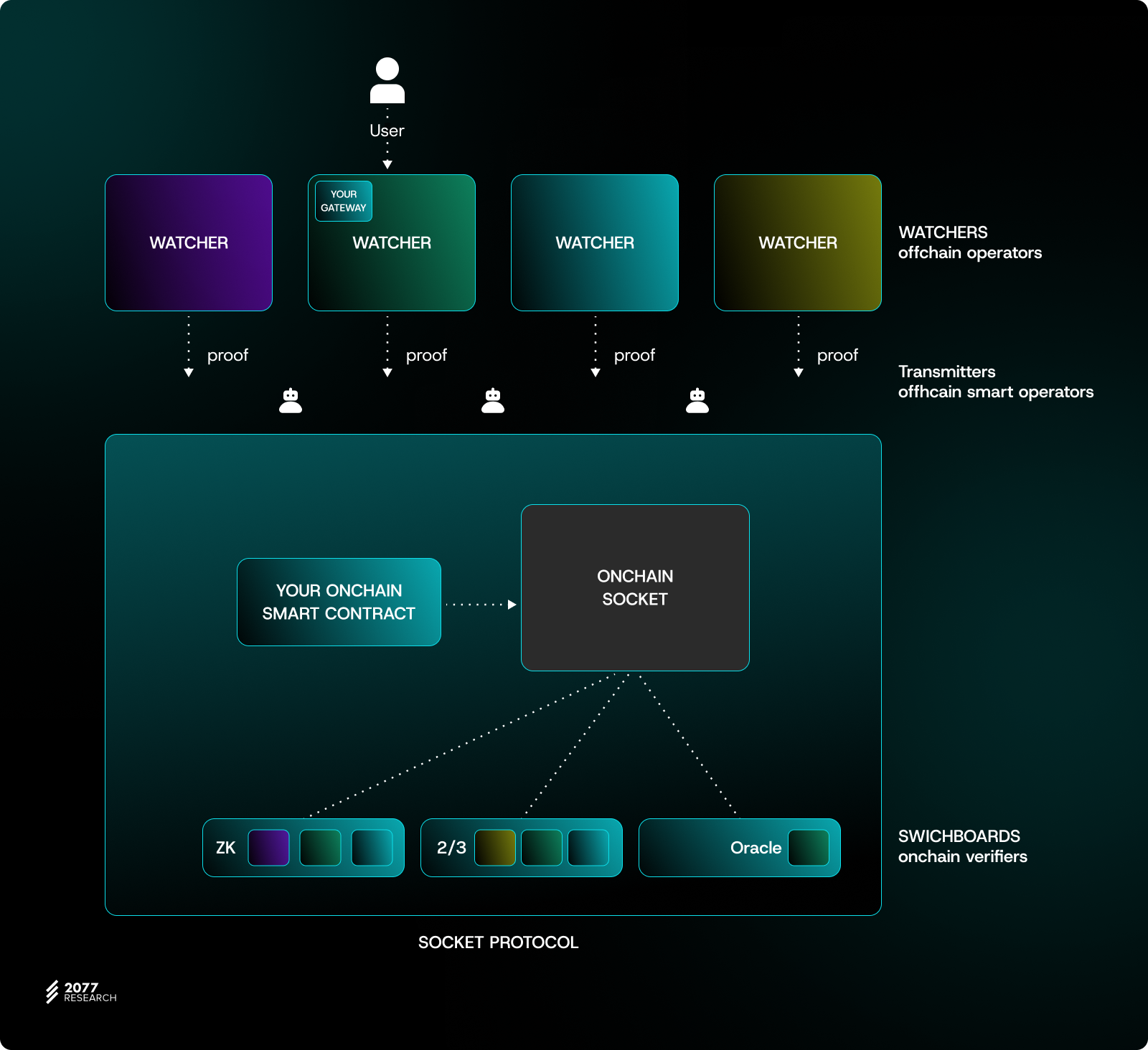 - Application contracts: these are minimalistic/lightweight instances of applications, designed to connect the SOCKET Protocol to contracts of the desired application on multiple chains. They are responsible for presenting an interface for users to craft their requests and pass them on for responses.