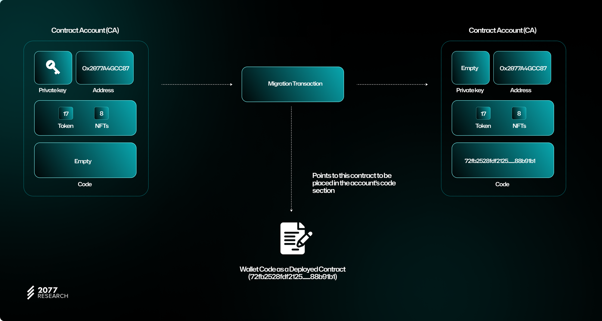 EOA migration involves converting an EOA to a contract account by assigning it a non-zero code value and revoking its private key. This code value assignment can be done by allowing the EOA to copy an existing contract's code directly or by allowing it to “point” to an existing contract's code—essentially delegating its execution logic to the contract.