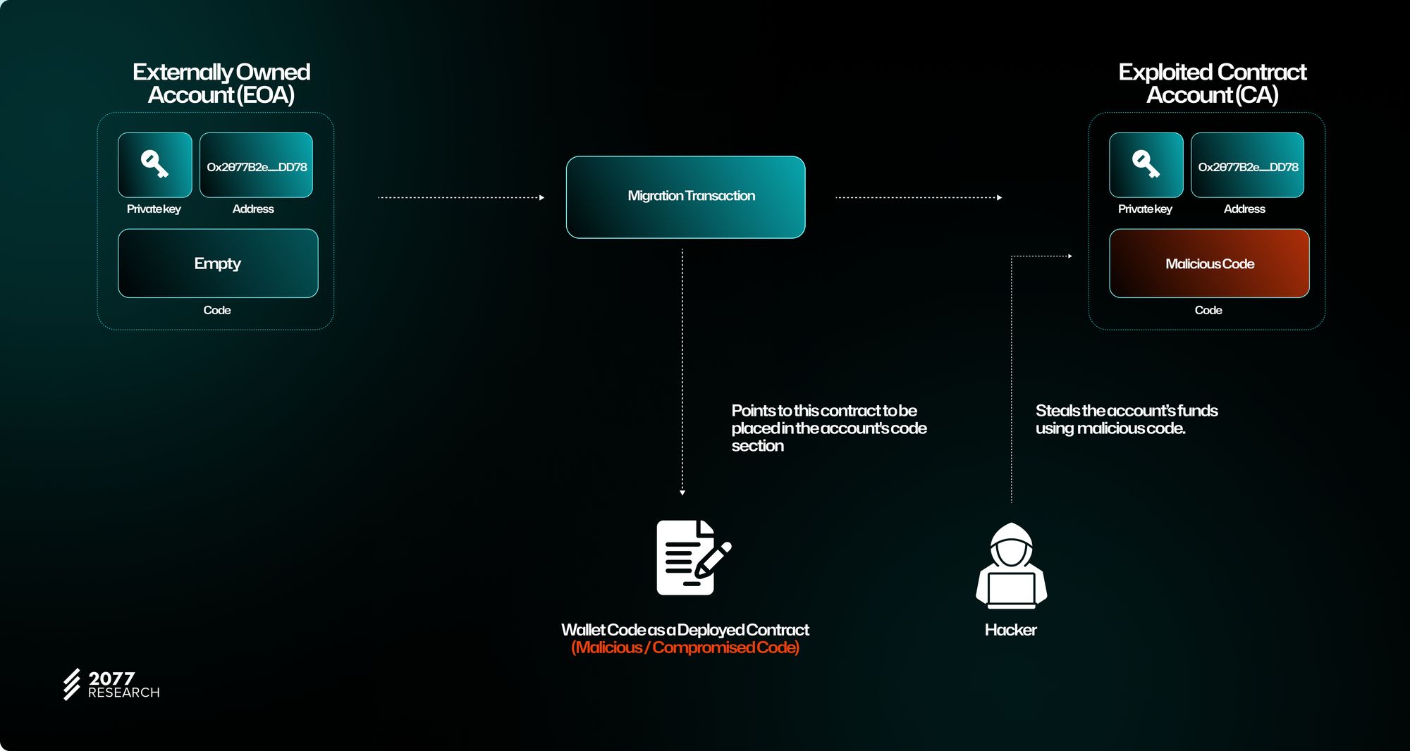 For example, unsuspecting users may authorize their EOAs to point to rogue contracts capable of stealing assets or executing malicious logic. The risk is compounded by the opacity of codeAddr values, which users typically sign without being able to read or verify.