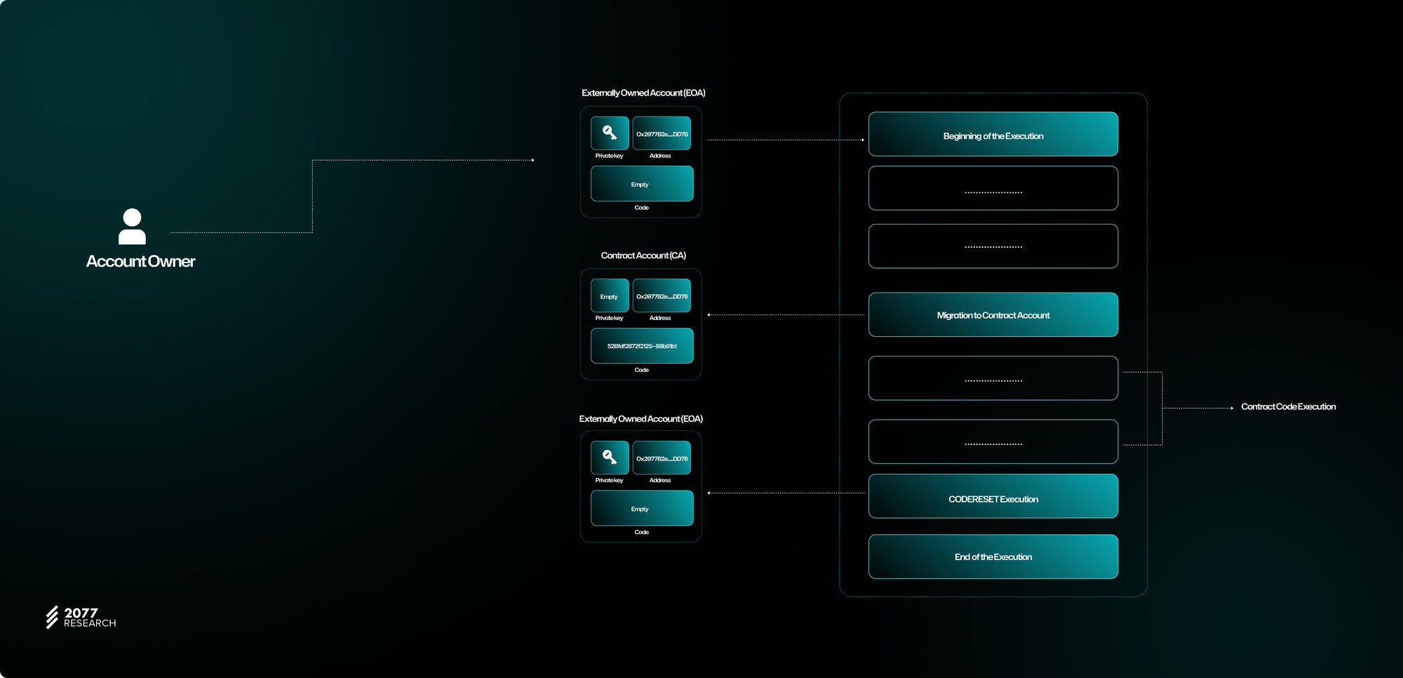 The proposal also offers another compelling feature: the ability for accounts to take on ephemeral functionality during execution. Through the inclusion of the CODERESET opcode in EIP-7702, calldata passed in an initialization transaction can execute the opcode after completing the target content code's logic—all in an atomic operation. This enables an EOA to begin a transaction as itself, transition to acting as a contract account during execution, and return to its EOA state at completion.