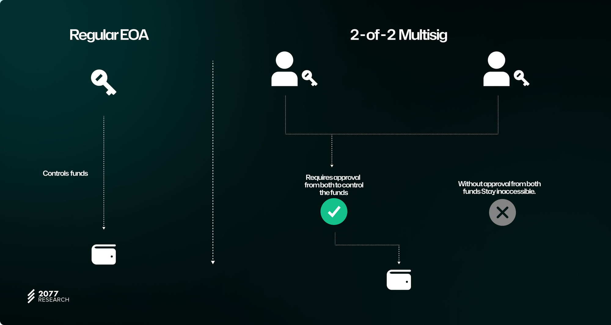 We can explore what this means for contract accounts by using the example of Alice, who owns a contract account that uses a 2-of-2 multisig scheme to approve transactions. An Ethereum node cannot confirm if the account’s owner authorized the transaction because it expects one signature generated with the private key—not two signatures on the same transaction.