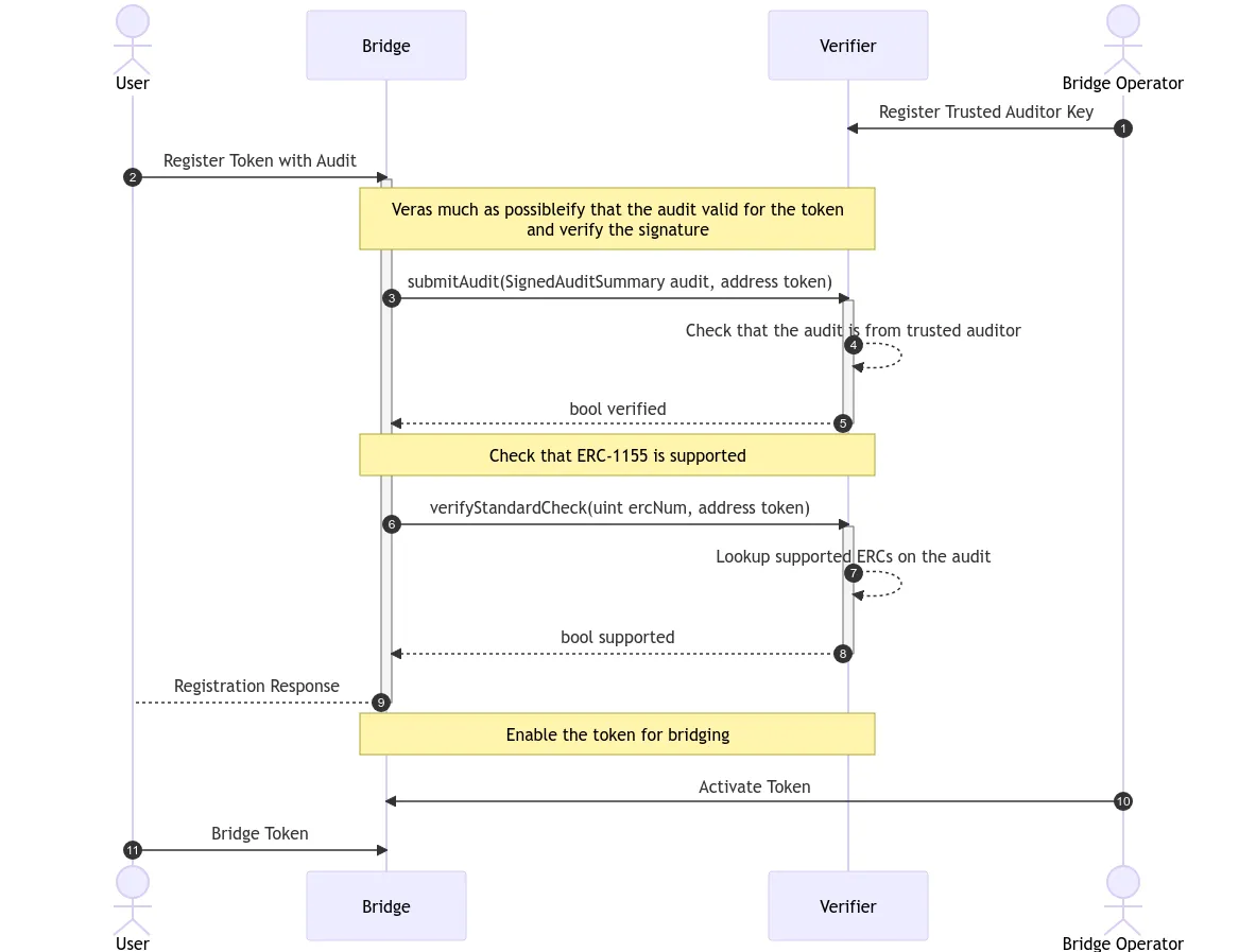 - The user in the diagram is bridging tokens for the first time and passes the audit report to the bridge operator. The bridge operator is assumed to have registered a list of public keys associated with “trusted” auditors in the verifier contract. The verifier is a contract that checks whether a new token is eligible for bridging (per rules defined by the bridge operator)