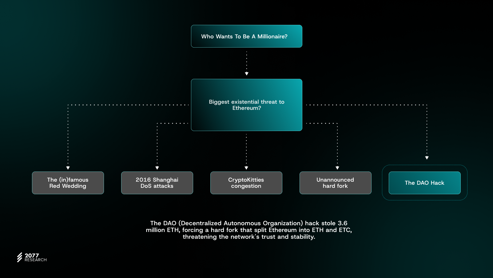 Imagine this scenario: you’re playing Who Wants To Be A Millionaire? and a million-dollar question comes up: “What event has represented the biggest existential threat to Ethereum in the network’s history?”