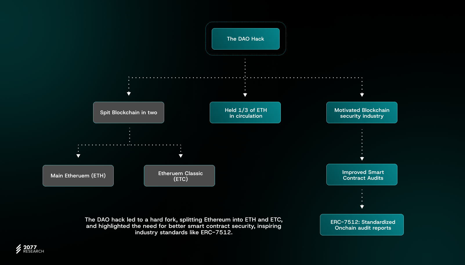 The DAO hack also underscored the importance of smart contract security to Ethereum’s future as a platform for coordinating economic activities on a global scale. This in turn motivated a diverse group of professionals within the Ethereum community to dedicate more attention to the problem of securing applications running in a distributed (and potentially adversarial) computing environment like the Ethereum Virtual Machine (some even credit the DAO hack for birthing the blockchain security industry).