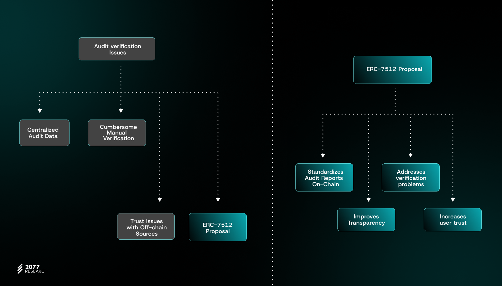 The first two problems have social dynamics, making them hard to solve, but the third problem is (surprisingly) tractable—especially if we leverage the blockchain for immutability and transparency of data. This is what ERC-7512 attempts to do by providing a uniform approach to verifying information about smart contract audits on the blockchain.