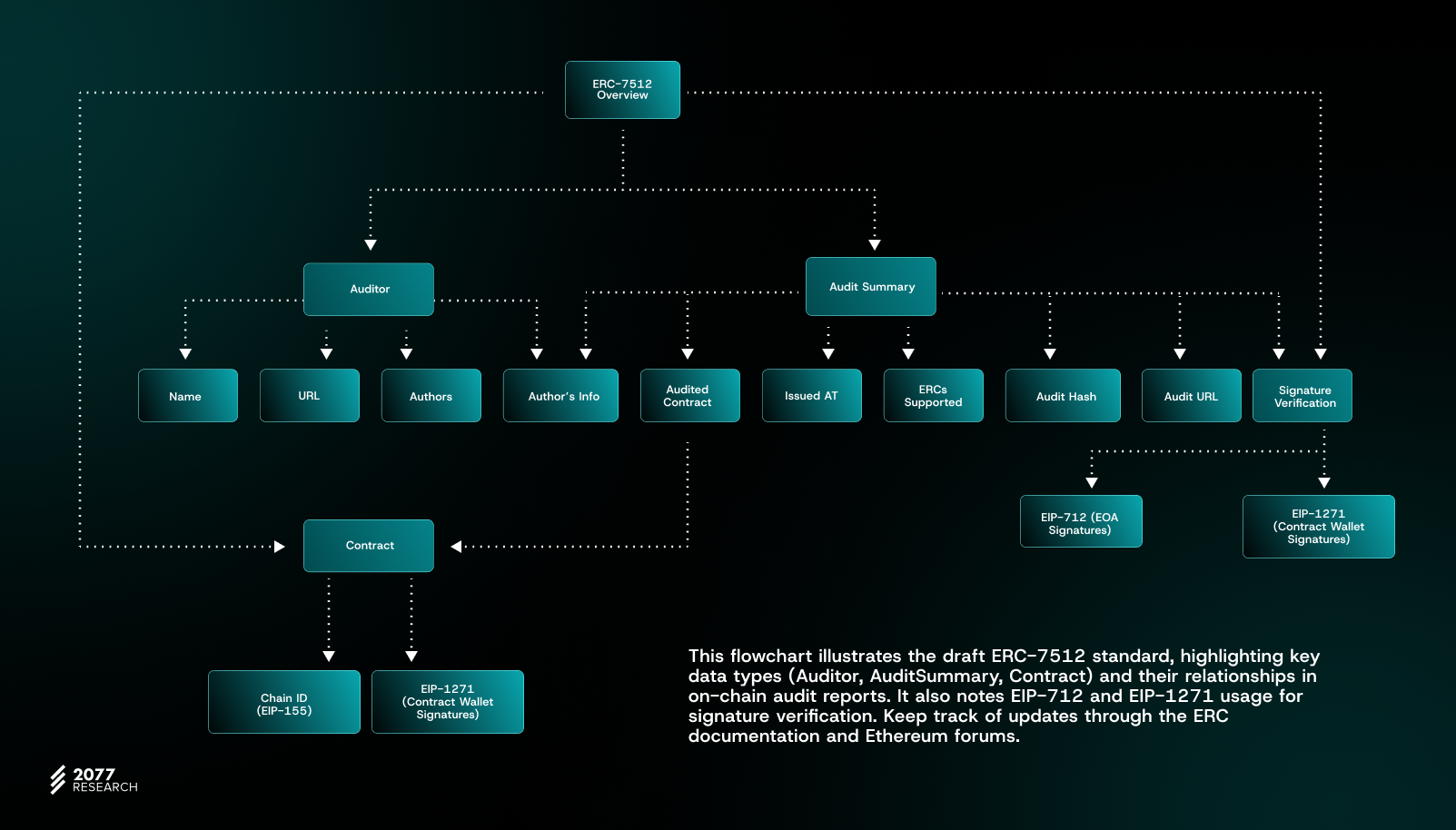 For a quick overview: ERC-7512 is a standard for creating on-chain, verifiable representations of audit reports that external contracts can parse to extract specific information about a contract’s audit procedure, such as the auditors that contributed to the audit and the list of ERC standards supported. ERC-7512 doesn’t declare a particular interface or function for extracting audit data and instead allows developers to implement bespoke schemes for retrieving information from on-chain audits.