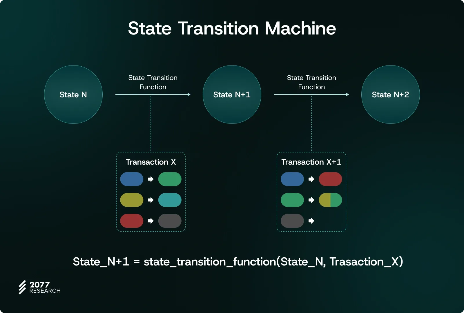 If you have $100 in the state we call "S" and want to send $10 to someone else, your balance in the next state, "S+1", will be $90. This process of applying transactions to move from one state to another is what we call an STF (State Transition Function).