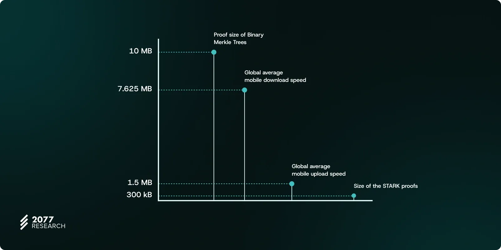 This optimization is particularly vital when considering the constraints of operating validators on light clients or devices with limited hardware, especially if you take into account that the average global mobile download and upload speeds are approximately 7.625 MB/s and 1.5 MB/s, respectively. Users can verify transactions with small, portable proofs without needing access to the full state, and validators can perform block verification tasks without storing the entire state.