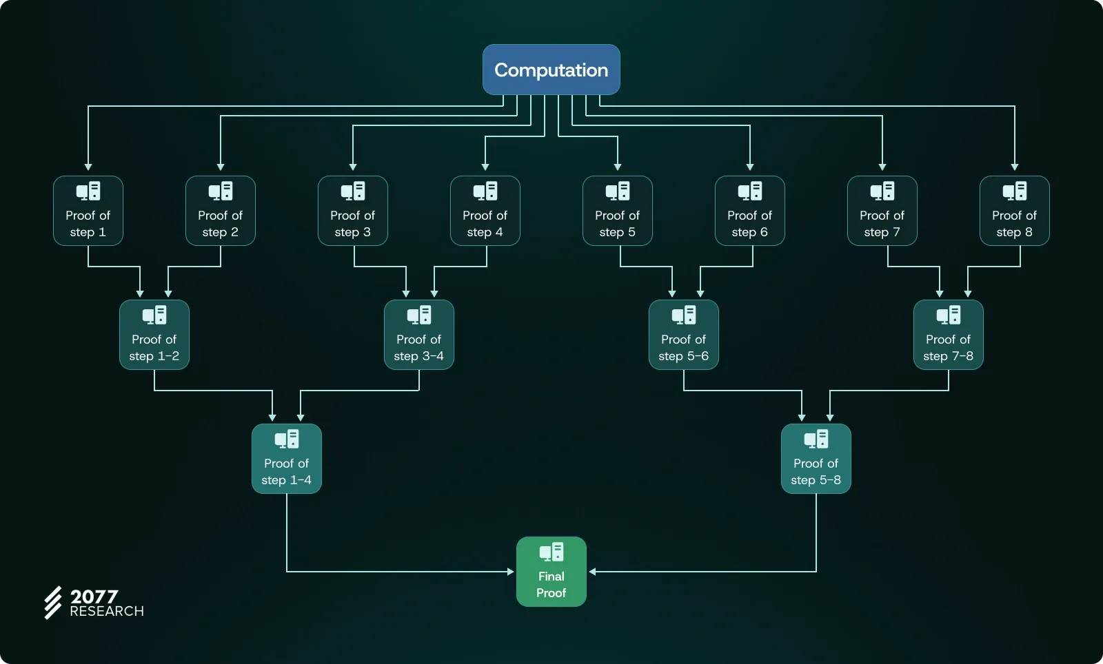 During proof generation, every small piece of the execution process (e.g., computation steps or data access) can be proven individually, and these proofs can later be aggregated into a single structure. With the correct mechanism, this approach allows a block’s proofs to be generated quickly and in a decentralized manner by many different sources (e.g., hundreds of GPUs). This boosts performance while also contributing to the decentralization goal by engaging a broader pool of participants.