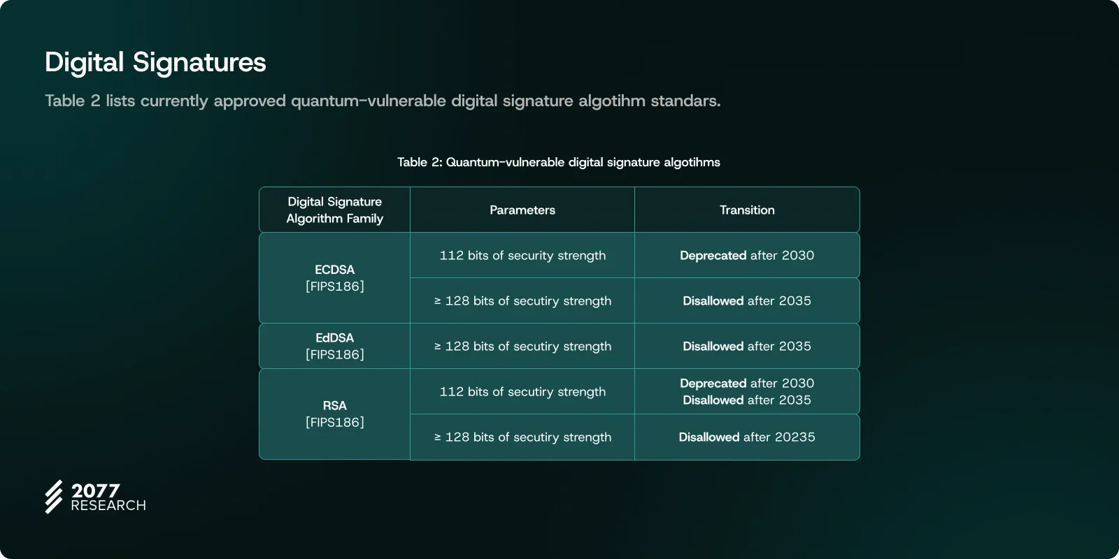 In this context, we see that Ethereum not only faces challenges with zk-unfriendly hash functions but also needs to reevaluate the digital signatures used in its consensus layer for long-term security. With the advancement of quantum computing, digital signature algorithms like ECDSA currently in use could face significant threats. As noted in the guidelines published by NIST, variants of ECDSA with a 112-bit security level will be deprecated by 2030 and completely banned by 2035. This necessitates a transition for Ethereum and similar networks toward more resilient alternatives such as quantum-secure signatures in the future.