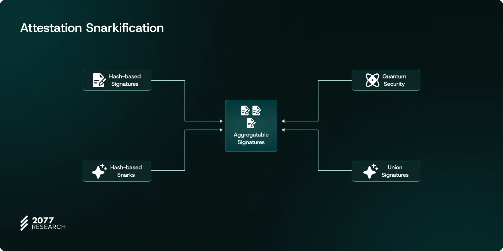 This system relies on combining hash-based signatures and hash-based SNARKs (STARK-like proofs) to create aggregatable signature schemes. Aggregatable signatures compress thousands of signatures into a single structure, reducing it to just a few hundred kilobytes of proof. This compression significantly decreases the data load on the network while greatly accelerating verification processes. For instance, the thousands of validator signatures produced for a single slot on Ethereum can be represented by a single aggregate signature, saving both storage space and computational power.