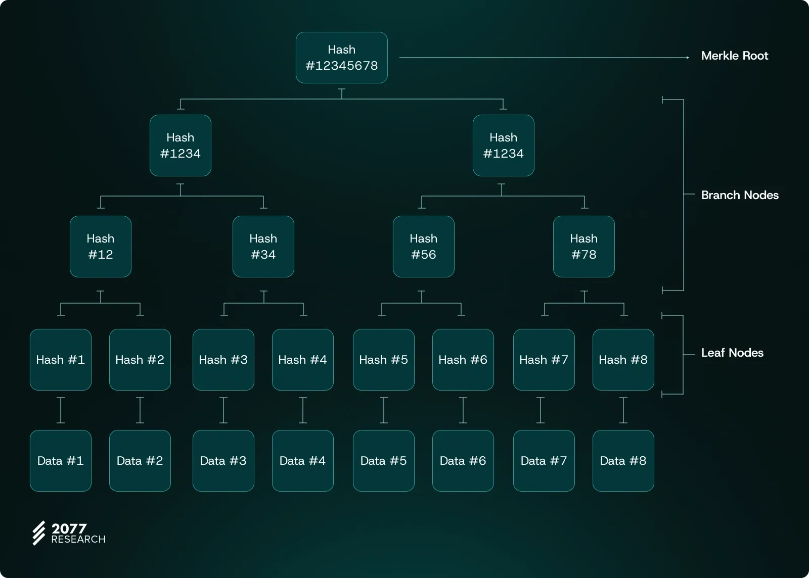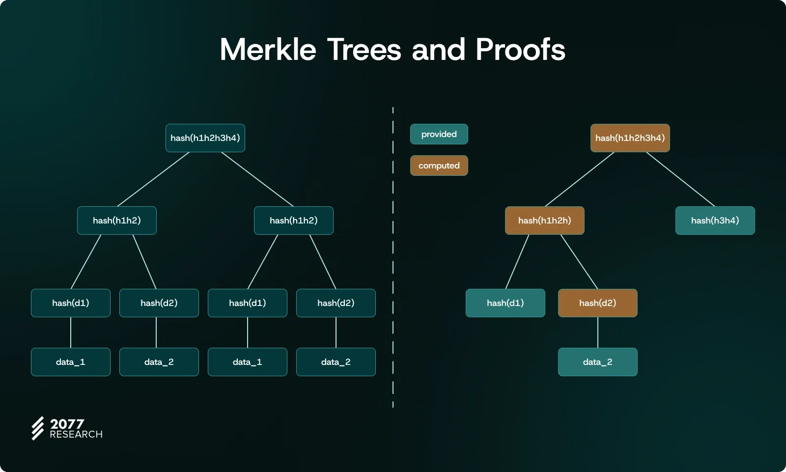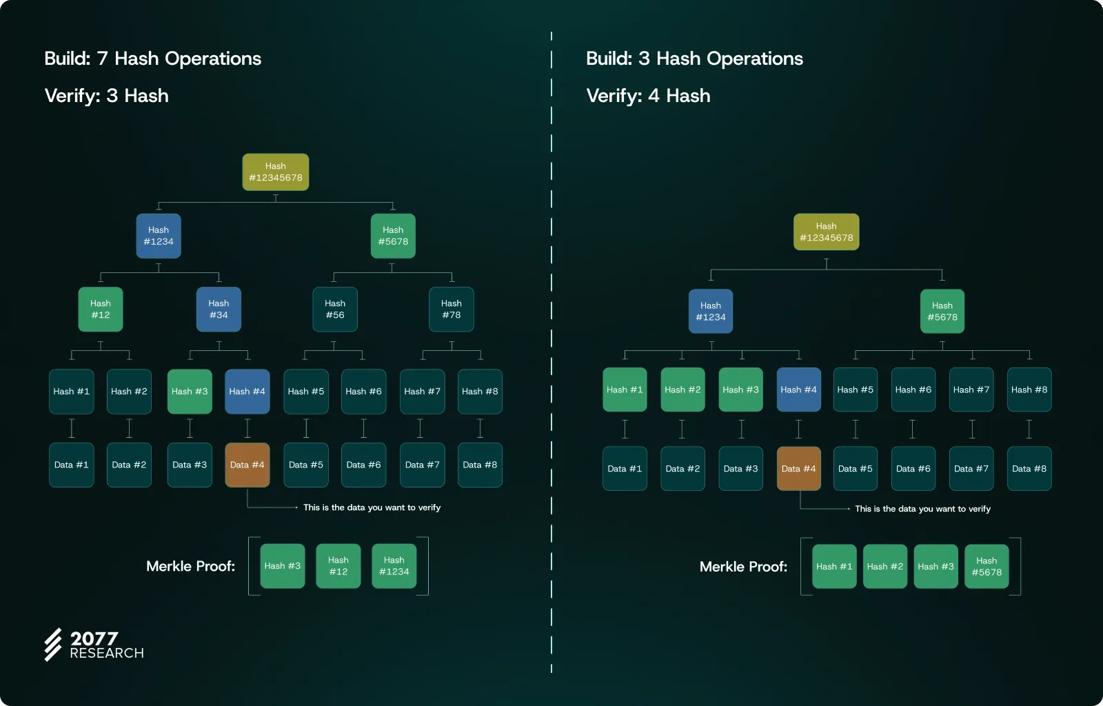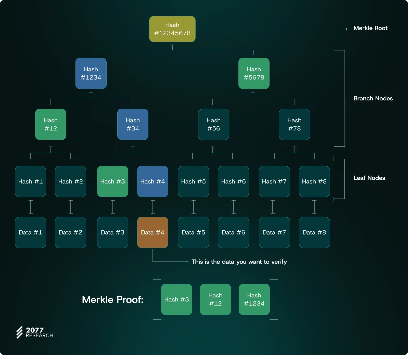 If the computed Merkle Root matches the state root in the block, we confirm that Data #4 is indeed valid within this state. If not, we know that the data does not belong to the claimed state, indicating potential tampering. As you can see, without providing the hashes of all the data or requiring the Verifier to reconstruct the entire Merkle Tree from scratch, the Prover can prove that Data #4 exists in the state and has not been altered during its journey—using just three hashes. This is the primary reason why Merkle Proofs are considered efficient.