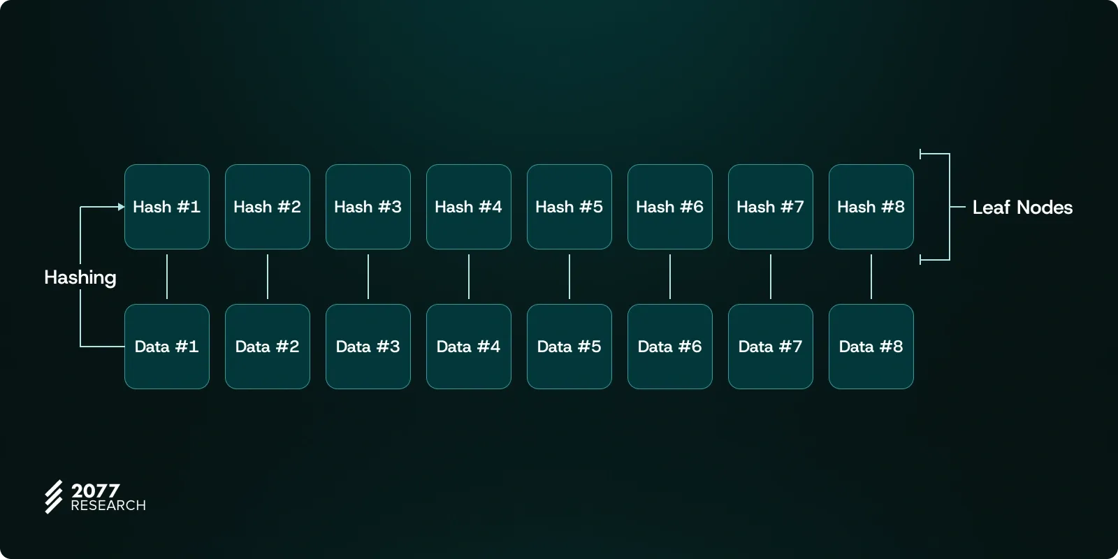 - Leaf nodes: These nodes contain the hashes of individual data pieces and are located at the bottom level of the tree. Each leaf node represents the hash of a specific piece of data in the Merkle tree.