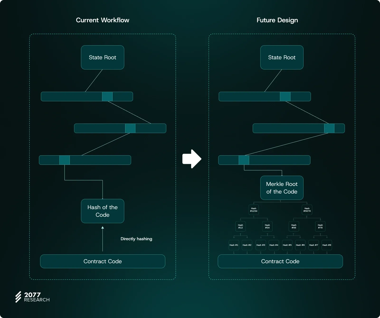 - Non-Merkelization of Code: Instead of incorporating contract code into the tree structure, Ethereum simply hashes the code and uses the resulting value as a node. Considering that the maximum size of a contract is 24 KB, this approach imposes a significant burden for achieving full verifiability.